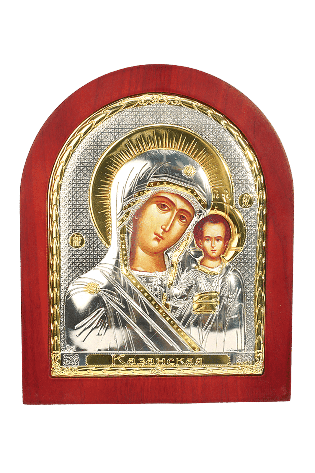 Holy Virgin of Kazan Silver Icon with Red Wood Frame 8.5x10.5 inch