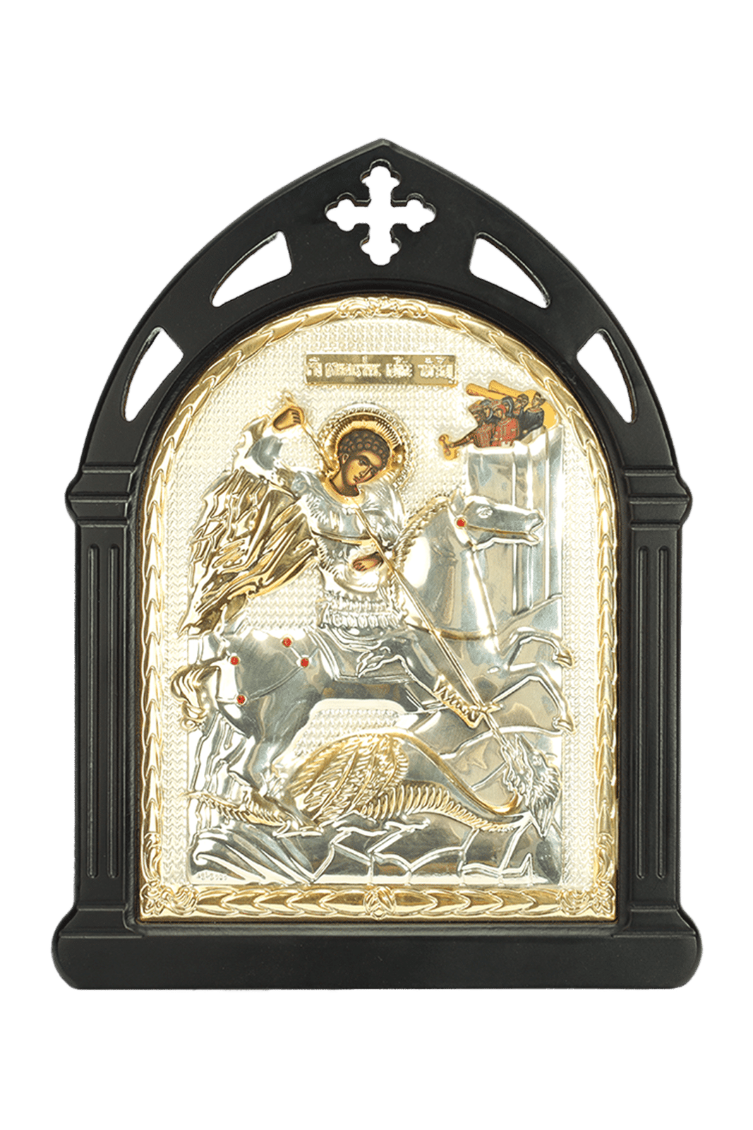 This exquisite Saint George Icon is expertly crafted with a silver plated finish and encased in a sleek black wooden frame. Perfect for religious decor, this icon beautifully showcases the renowned saint known for his bravery and protection. Add a touch of elegance and reverence to any space.
