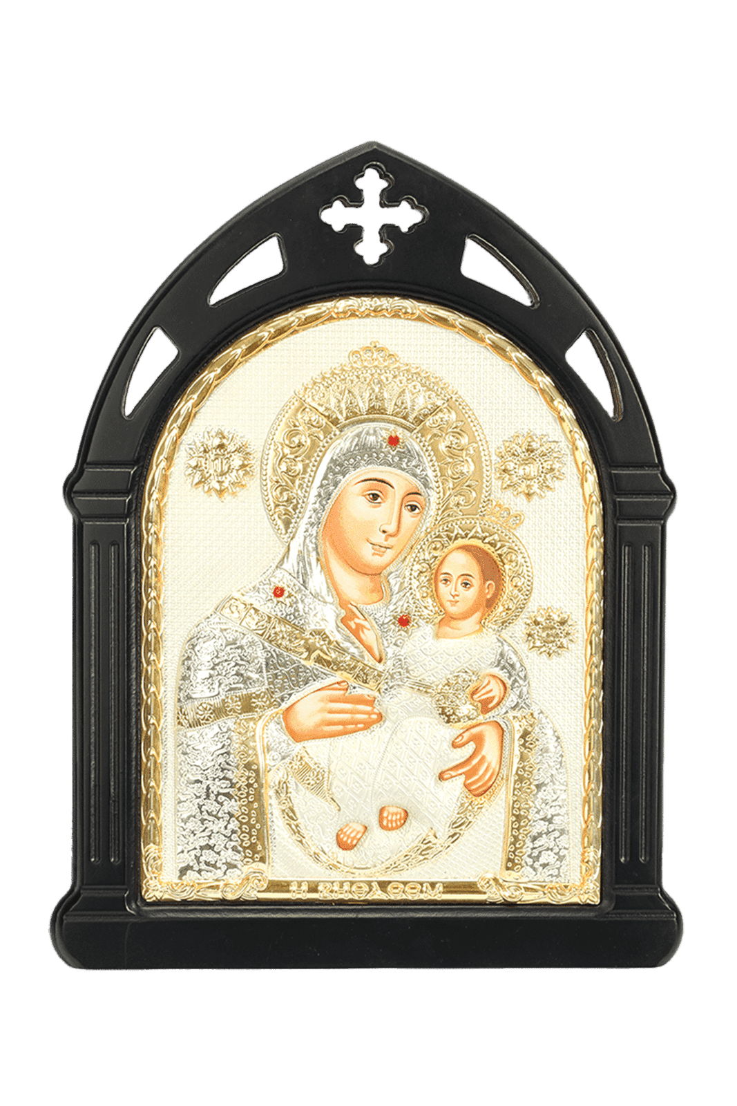 This 8.5x10.5 inch Virgin Mary & Baby Jesus Icon is crafted with a gold and silver wooden frame, adding a touch of elegance to any room. Displaying this iconic image can provide a sense of spiritual comfort and serve as a reminder of faith. Enhance your decor with this timeless piece.